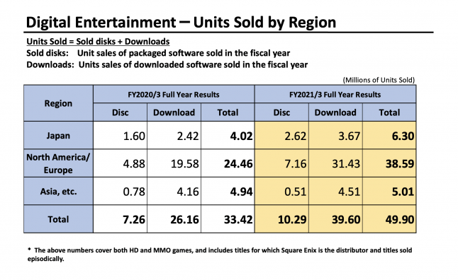 Across the entire segment, combined sales of packaged and digital software totaled 49.9 million units, up on the 33.42 million units Square Enix sold during FY2020 — with digital sales accounting for 39.6 million of that total.