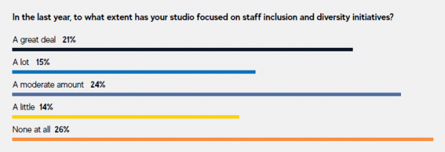 It’s a trend towards inclusivity that may have been impacted by the global Black Lives Matter movement that re-entered the headlines after the murder of George Floyd in 2020. 31 percent of respondents said that their studios did implement inclusion initiatives in response to the movement’s growth last year. (38 percent replied “no,” the rest answered “Don’t Know/Not Applicable.”)