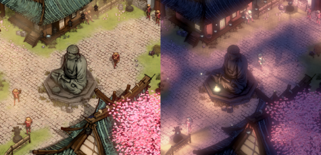 With our chosen art style of Shadow Tactics we embraced the new setting by referencing Japanese ink drawings. This helped us to create a unique look that is instantly recognizable in each and every screenshot you may come across. This is something we are always aiming for when developing a new art style which is easier to achieve with more stylized than photorealistic graphics. Whether doing so for this genre was the right decision will be further discussed under What went wrong: Art Style versus Genre.