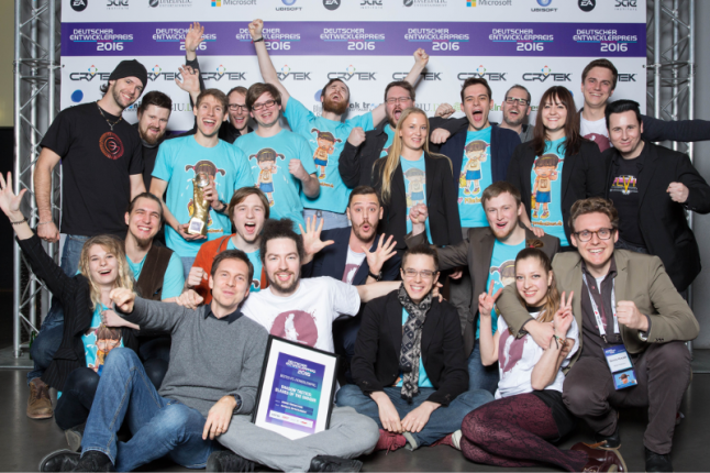 The whole team, including all contributing interns and freelancers, winning awards at the German Developer Award 2016 (picture by Jennifer Pitton / www.expo-motion.com).