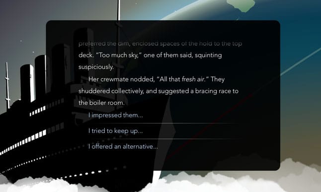 However, there are ways you can mitigate the chances of taking the player out of it. In 80 Days different choices occur in the text based on your previous choices, or the items in your luggage, or the places you’ve been to. The trick is how that information is obfuscated. Meg Jayanth, writer of 80 Days, explains it: “There are actually quite a lot of dialog options in the game that are based on particular modifiers, like if youare a particularly good valet, or a particularly well dressed one, but we don’t have a symbol beside them that tells you ‘This is your skillful option.'”