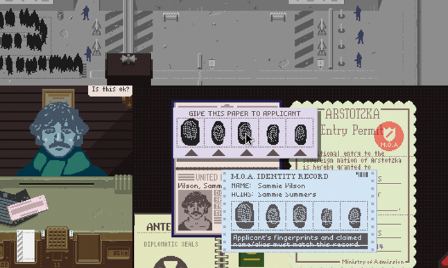 “‘Not knowing’ permeates the entire game — I think it’s the key element of border inspection,” Pope tells me. “You make choices on very little information, and often don’t even see the results of your decisions. The person you just approved or denied walks out of your booth and you have no idea what happens to them. I wanted to take that low-level nebulous uncertainty and extend it to every aspect of the story. You have so little information about everything that almost nothing is ever certain. Even the sympathetic sob-story immigrants could just as easily be conning you.”