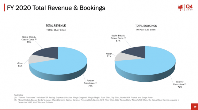 Zynga explained its ‘forever franchises’ like CSR Racing, Empires & Puzzles, Merge Dragons!, Words with Friends, and others pulled in 70 percent of that annual revenue, and also accounted for 72 percent of total bookings.